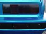 Zelf gemaakte achterspoiler, donkere achterlichten en mistlampen, luxe deurpaneel.